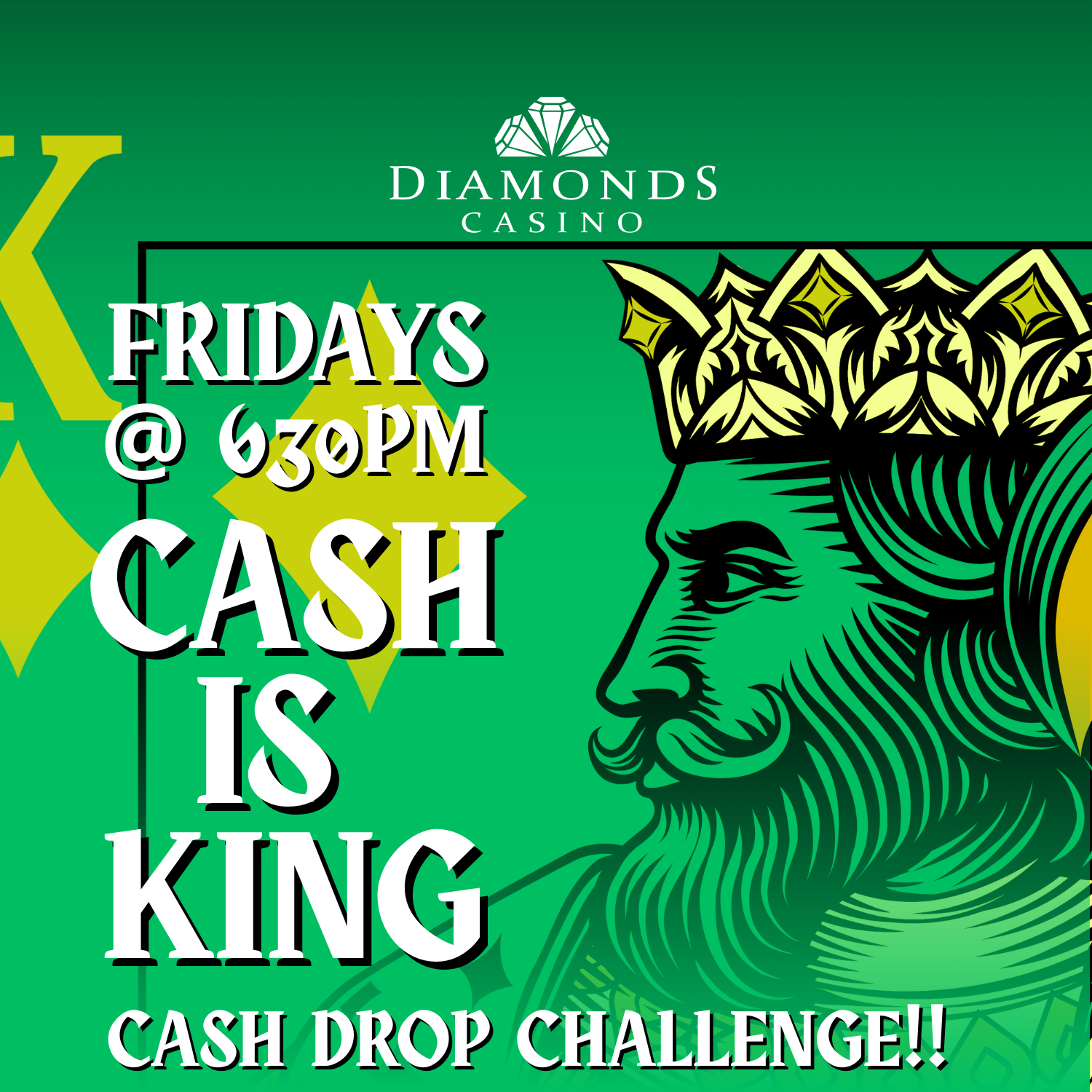 Our events change monthly so visit us often and remember Cash is King at Diamonds Casino.