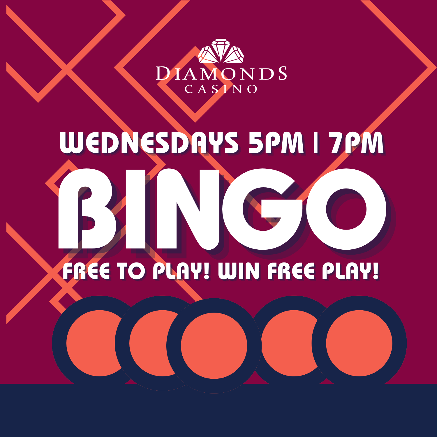 Play FREE bingo on Wednesdays at 5pm and 7 pm. It’s a great time to grab a bite to eat and settle in for some exciting bingo. Whether you are a seasoned dauber or a first-timer Play, Win and Socialize with your Bingo Buddies.